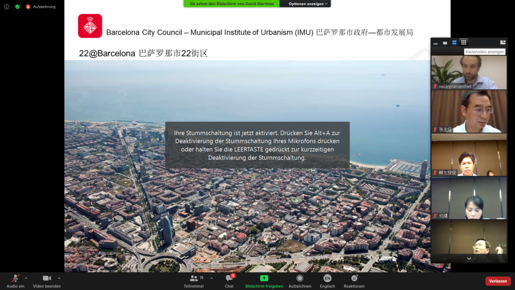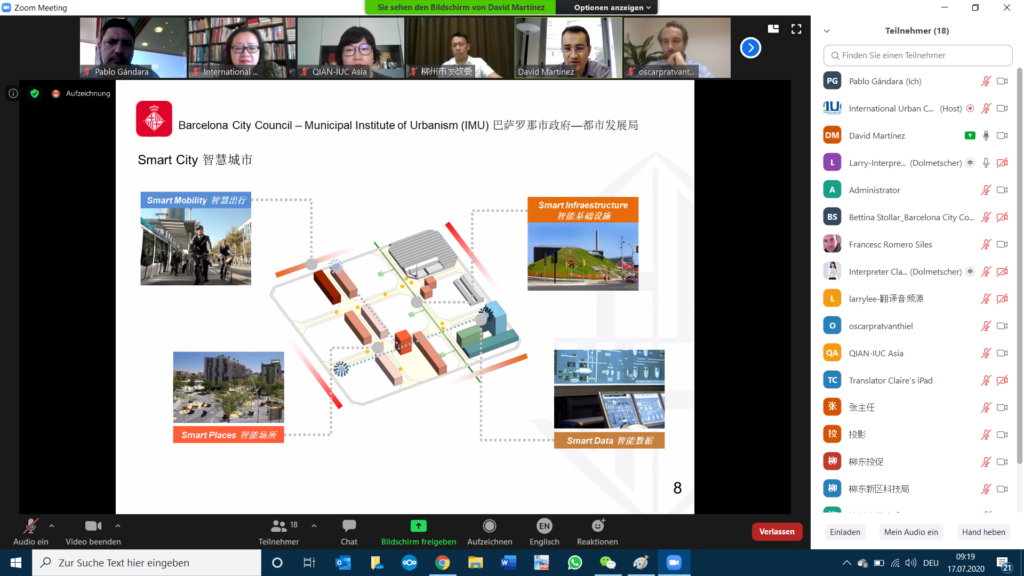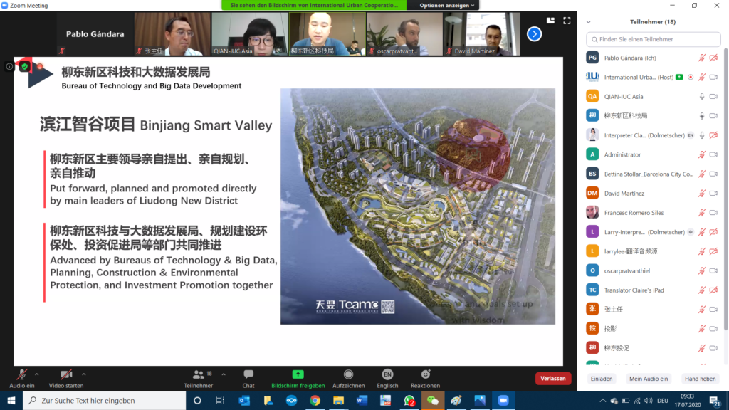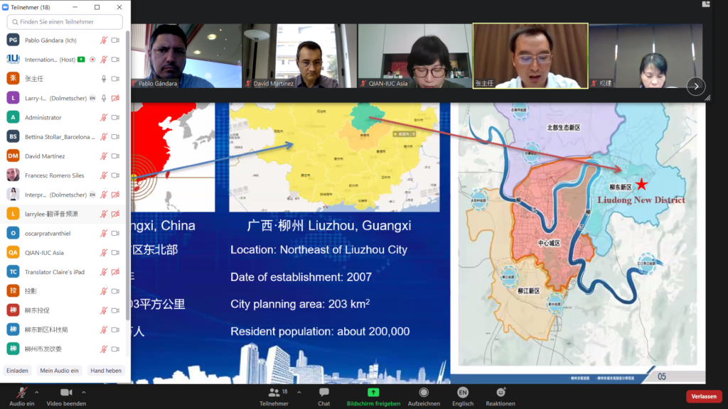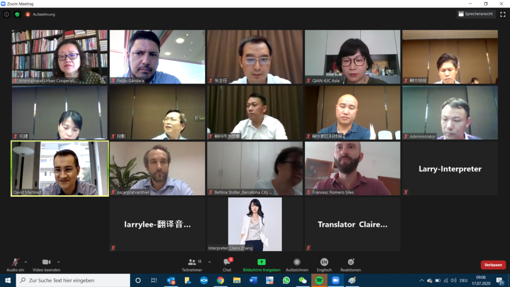 在5月19日柳州与IUC团队在线研讨会之后,在IUC团队的支持下,7月17日来自巴塞罗那和柳州的15余位专家召开首次在线会议,共同讨论双方在柳东新区最新规划建设的科技园——滨江智谷的合作,这也是在IUC项目机制下柳州-欧盟区域合作示范项目的重要组成部分。
