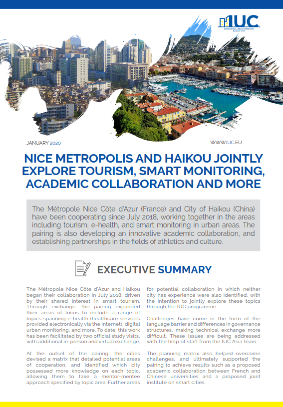 The Brussels-based IUC project support team elaborated a case study reflecting on the cooperation between Metropole Nice Cote D’Azur and Haikou (Hainan). The document focuses on areas like tourism, e-health and smart monitoring in urban areas. It also showcases innovative academic collaboration under development, as well as possible partnerships in the fields of sport and culture. Challenges, solutions, impact and lessons learned are reflected.