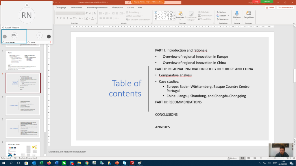 Experts from Europe and China held an online exchange on the regional innovation study being elaborated with the support of the EU and the NDRC. Amadeo Jensana, Director of Casa Asia in charge of the study elaboration, introduced with European and Chinese colleagues the state of art. Robert Hassink from Kiel University focused on the support of regional innovation to cohesion and decrease inequalities. He also referred to the different typologies of regions in Europe depending on the level of autonomy and to the importance of interregional partnerships. Liu Lun from Peking University referred to the provincial autonomy power when implementing / mirroring national innovation strategies. Pablo Gándara from the IUC project referred to the one-size-fits-all approach that seems not to be any longer the case in Chinese provinces.