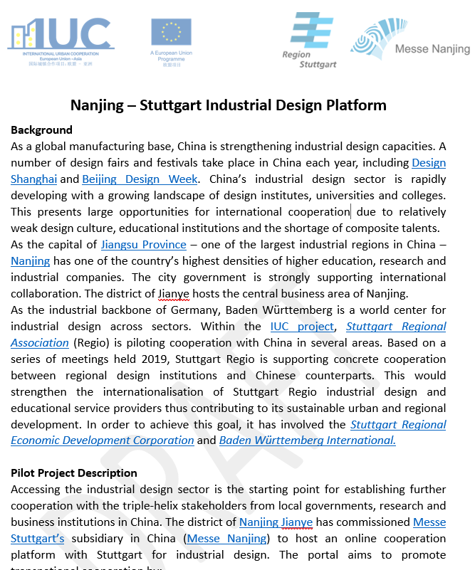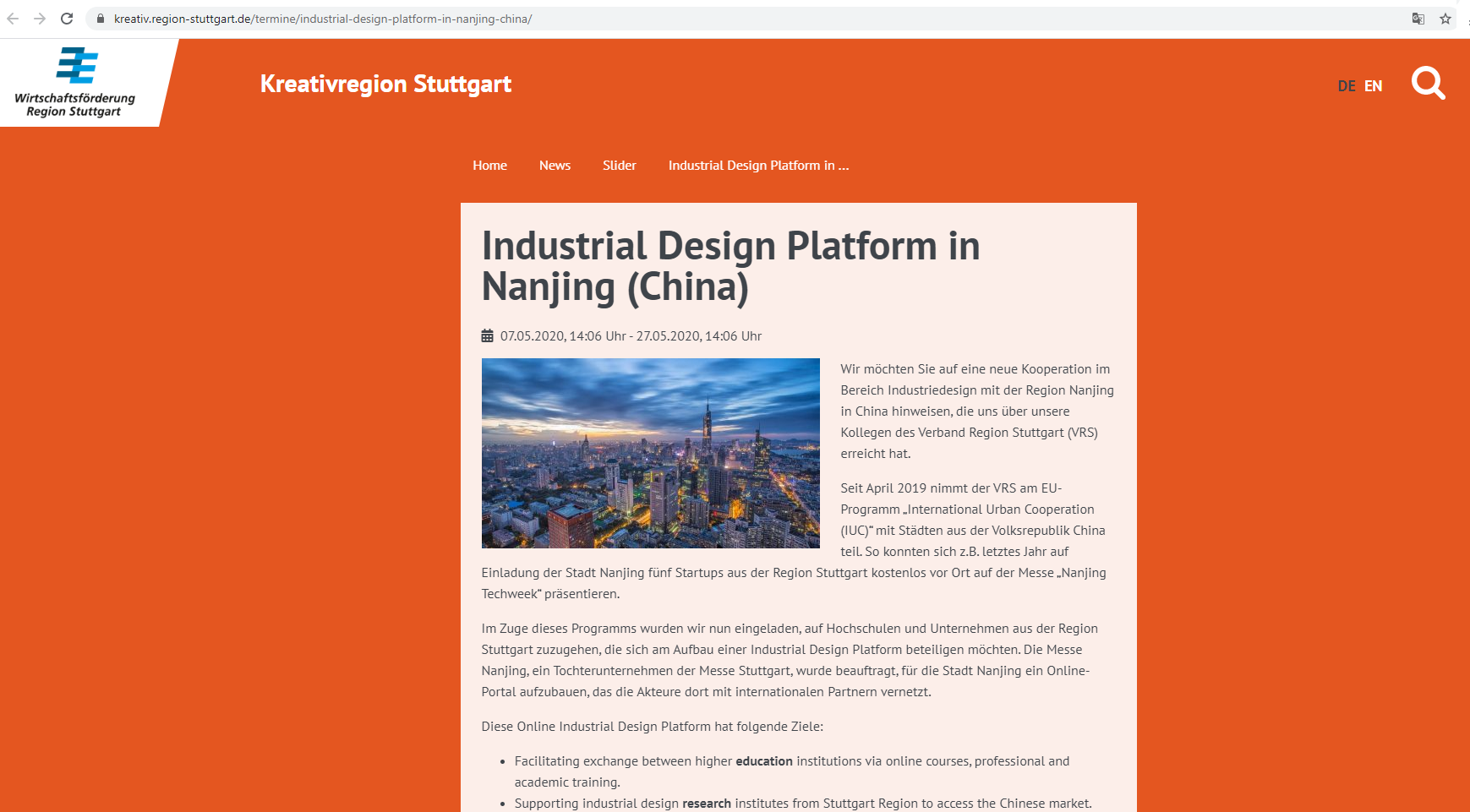 See also website news at Stuttgart Regional Economic Development Agency: https://kreativ.region-stuttgart.de/termine/industrial-design-platform-in-nanjing-china/