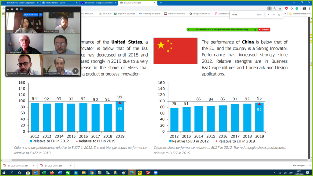 The IUC project held today an experts’ discussion on the EU-China Regional Innovation Study currently under elaboration. The meeting was moderated by Amadeo Jensana and Guillermo Martínez from Casa Asia. At the exchange, Prof. Lun Liu and Prof. Robert Hassink introduced the updated version of the European and Chinese case studies, namely Baden-Württemberg (DE), Centro (PT), and the Basque Country (ES) as well as Jiangsu, Shandong and Chongqing/Chengdu – all in China. Experts discussed the impact of the COVID19 crisis on sectoral deglobalisation and its impact on regional innovation. Along with Dr. Ronald Hall – Senior Adviser to DG REGIO – they debated about the differences between regions depending on the global value chain and those focused on endogenous consumption. Moreover, regional innovation capacity is strongly linked with the political-administrative structure of the regions also in Europe, they said. They also discussed possible comparisons schemes of regional innovation schemes and agreed to avoid oversimplification as regional innovation approaches are very diverse in both China and the EU. Experts referred to the European innovation scoreboard 2020 recently published, discussed possible policy recommendations to be included in the study, and agreed on the next steps. The discussion was joined by IUC team experts who provided their insights on regional innovation cooperation between European and Chinese regions.