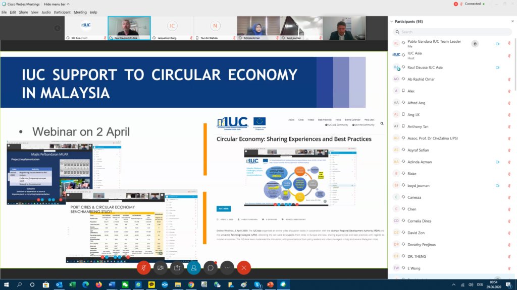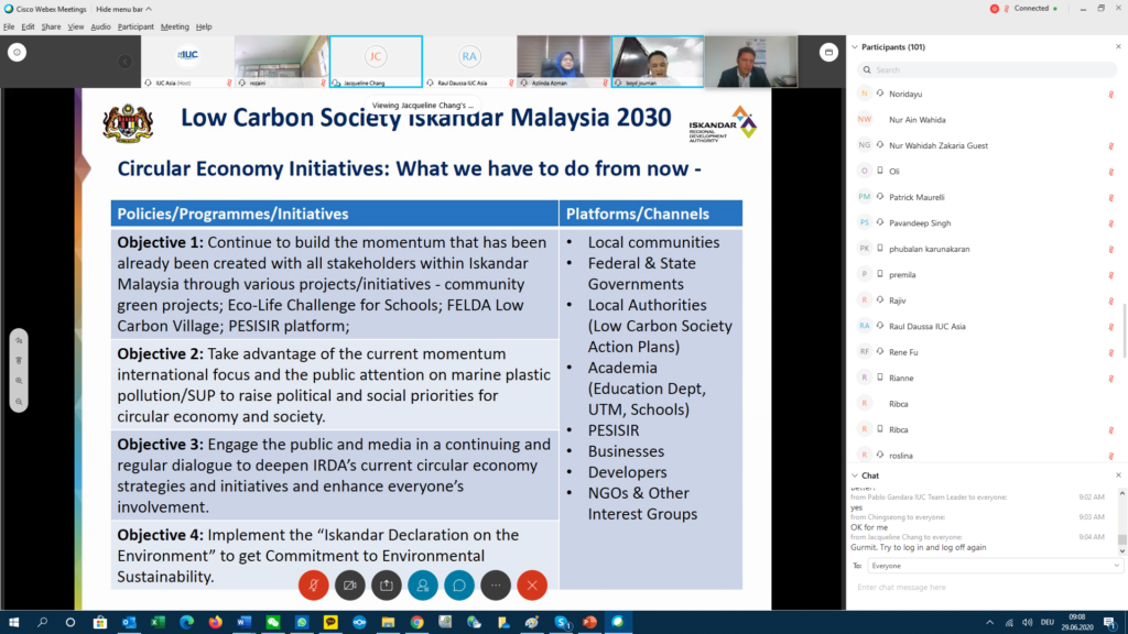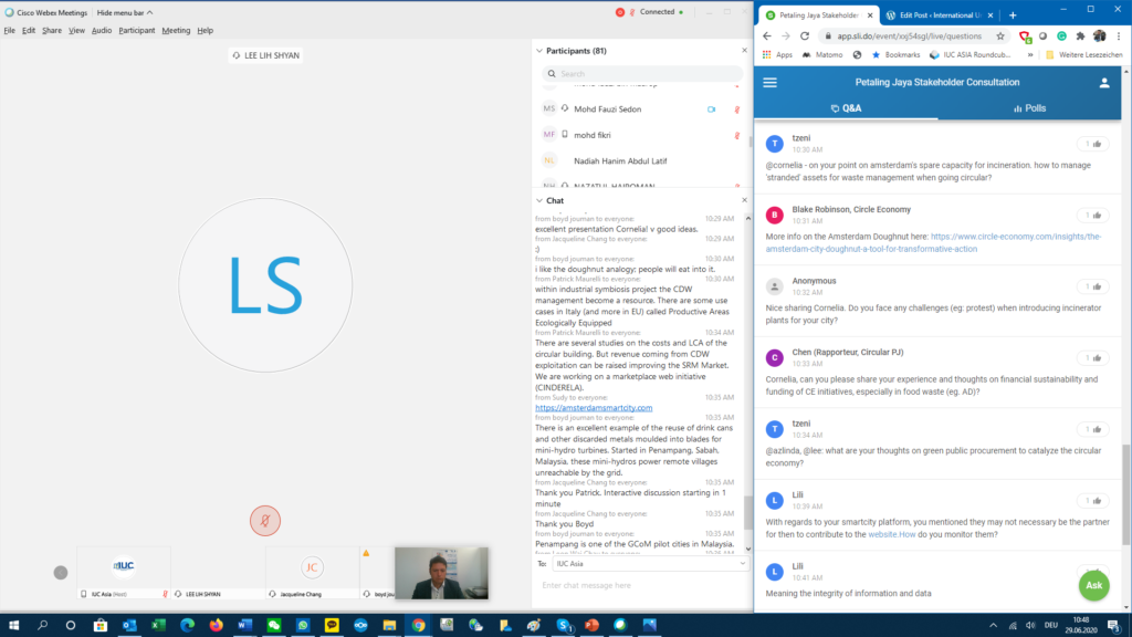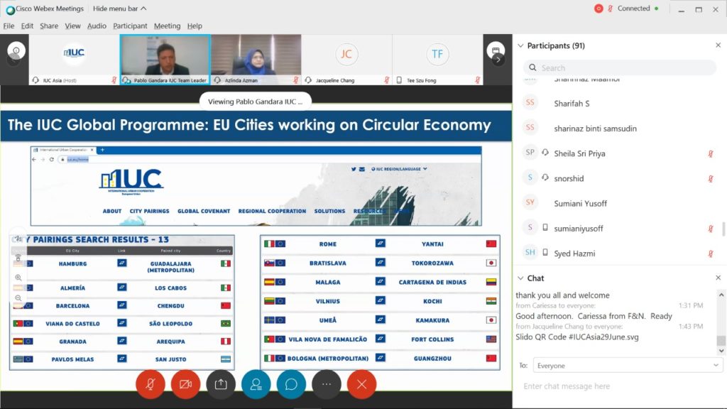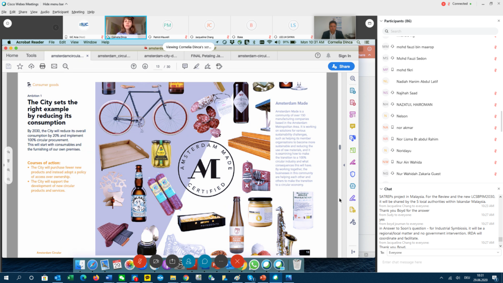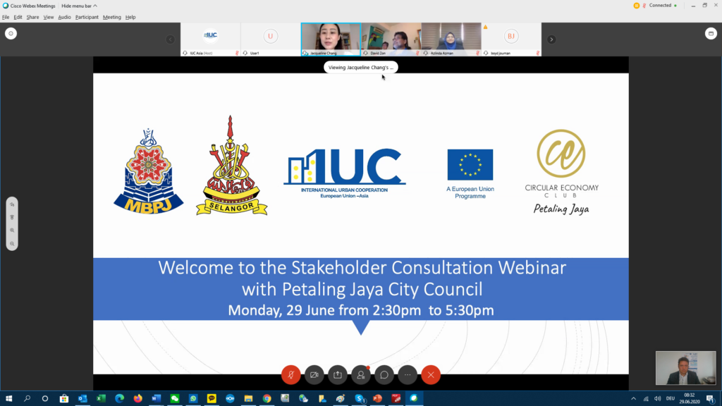 Over 100 experts from Malaysia and Europe have joined today’s stakeholder consultation webinar on circular economy in the city of Petaling Jaya. The event was opened by the Deputy Mayor, Ms. Azlinda Azman and included presentations by experts from Malaysia (Petaling Jaya City Council, Iskandar Regional Authority) and Europe (Sapienza University of Rome, Amsterdam Smart City, the Circular Economy Club, Cities at Circular Economy and the IUC Asia team). This stakeholder consultation webinar enabled representatives from the government, private sector, research and civil society to dialogue with experts from European cities and organisations on the subject matter. Participants were also exploring how city-to-city cooperation with European pairs will support the transition of Petaling Jaya to a circular city. The meeting was moderated by Ms. Jacqueline Chang, Circular Economy Consultant, IUC Asia.