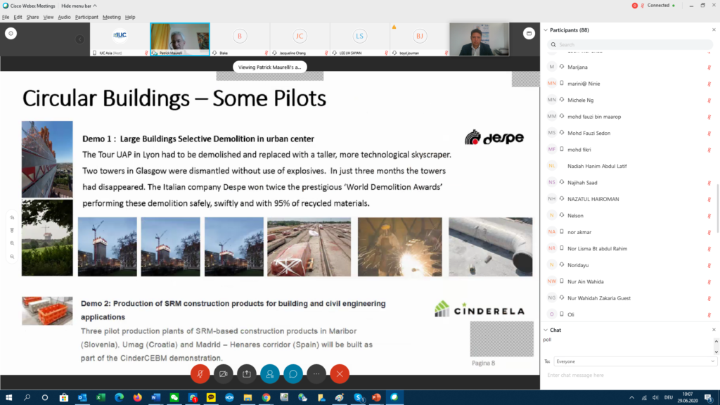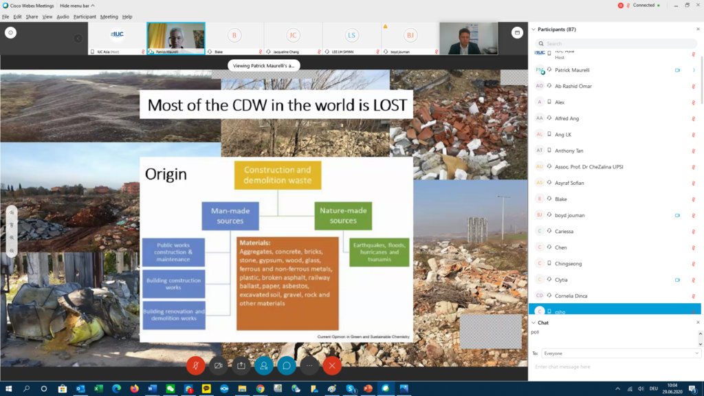 Patrick Maurelli from CITERA at Sapienza University in Rome focused on Construction & Demolition Waste (CDW) and introduced basic figures worldwide, explaining that most of the CDW in the world is lost and not recycled. He introduced few best practices from projects supported by the European Union, including CINDERELLA for new business models including a secondary raw materials (SRM) market. He also showcased start-ups like Atlante Inerti, which designs SRM-based products.