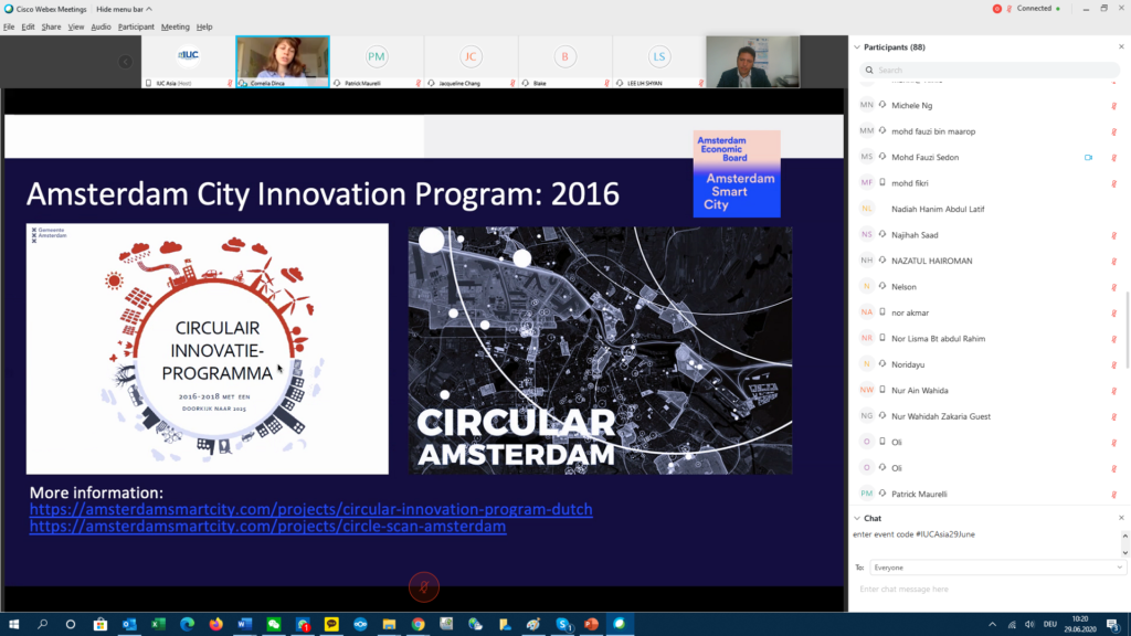 Cornelia Dinker from Amsterdam Smart City introduced the quadruple-helix platform as well as Amsterdam’s circular innovation ecosystem. She showcased a few best practices including the Schoonschip project and the newly approved Amsterdam Circular Strategy 2020-2025. Cornelia introduced Amsterdam’s ‘doughnut’ model for the transition towards a circular economy, something especially relevant in the post-coronavirus economy.