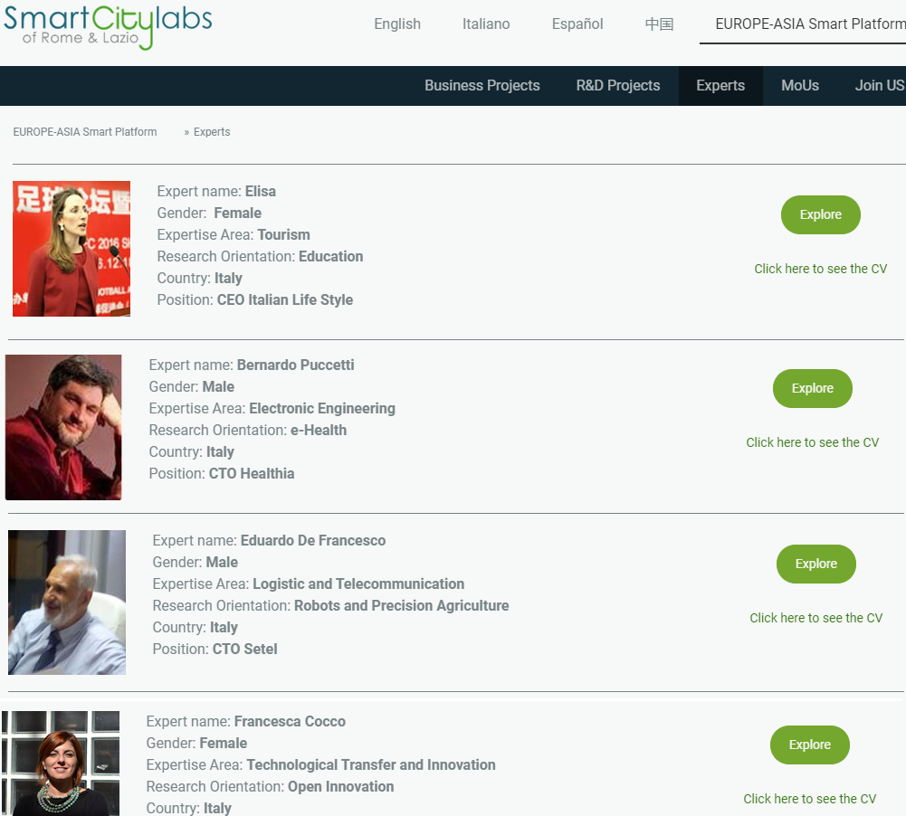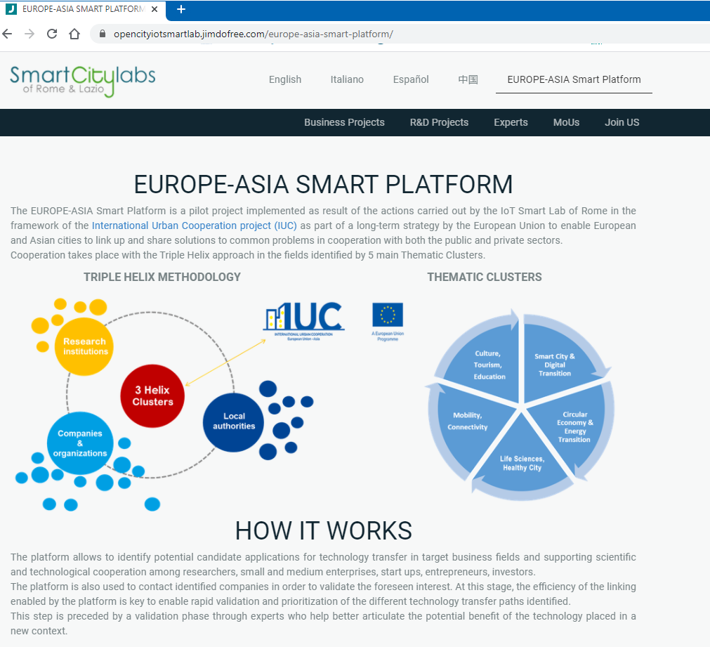 The Smart City Lab of Rome and Lazio – co-funded by the European Union’s regional development fund – launched the EUROPE ASIA SMART PLATFORM to facilitate scientific and technological cooperation among researchers, small and medium enterprises, start-ups and investors from Lazio and China. The platform allows to identify potential candidate applications for technology exchange in target business fields and to contact identified companies, thematic experts and projects.