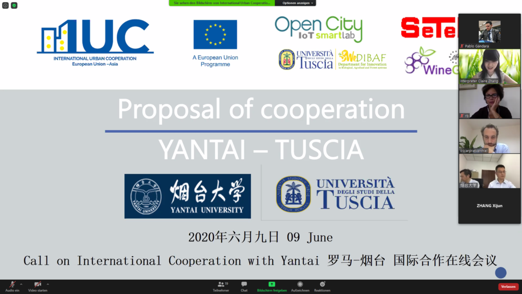 Professor Felicetta Ripa introduced the international activities of Tuscia, including cooperation agreements in China with the Sichuan Provincial Institute of Natural Resource Science, the South China Botanical Garden, the Chinese Academy of Sciences and the Anhui Agricultural University. She proposed to support exchange with Yantai within existing programmes including the International Credit Mobility KA107 (mobility of University students, professors, researchers, administrative staff), capacity building projects between EU and Extra EU Universities, the Strategic Partnership programme and the upcoming Horizon Europe 2021-2017 programme.