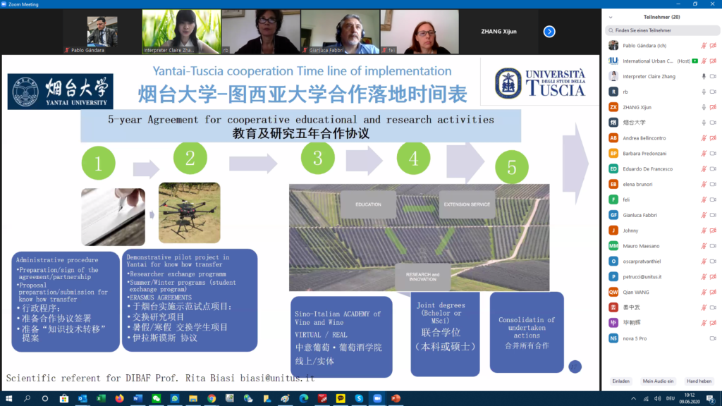 Professor Rita Biassi from the Department for Innovation in Biological, Agri-food and Forest Systems (DIBAF) at the University of Tuscia proposed to cooperate in urban/peri-urban viticulture and integrated landscape management as a way to maintain the competitiveness of the wine sector in light of ongoing environmental emergencies, e.g. land degradation. Peri-urban areas surrounding large cities like Rome and Yantai are crucial for sustainable regional development as they include transition zones. Professor Biassi stated that climate change is a challenge that makes the development of new grapevine geography necessary. Peri-urban areas in the Lazio region need to develop adaptation and mitigation strategies in a contest of decreasing surfaces and increasing wine consumption. Cooperation with China would support the sustainable development goals of the UN, specifically goal 2 (zero hunger), 11 (sustainable cities and communities), 13 (climate change), and 15 (life on land).
