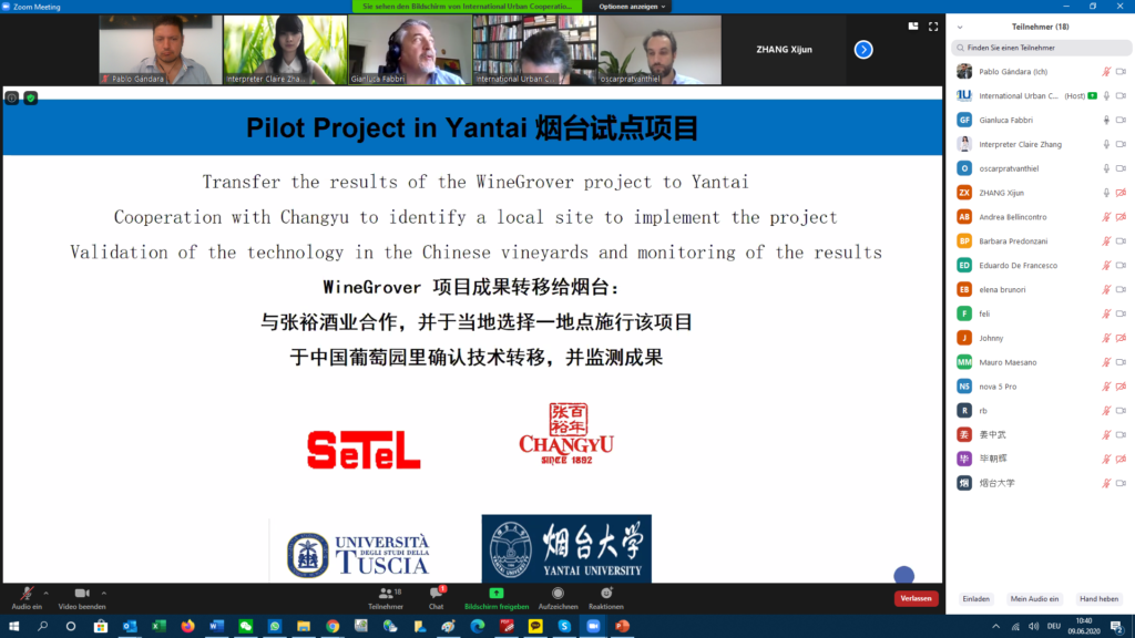 - Include Yantai into the existing EU Wine Grover project activities for Precision Agriculture, funded by the EU’s LIFE programme and involving Tuscia University. The project demonstrates how the application of advanced techniques in precision farming for viticulture, combined with the use of different drones and sensors, can have an important effect in terms of reducing greenhouse gases and soil protection. Partners agreed to involve the companies SETEL and Wellness TechGroup (both from Rome) and Changyu Winery (Yantai)