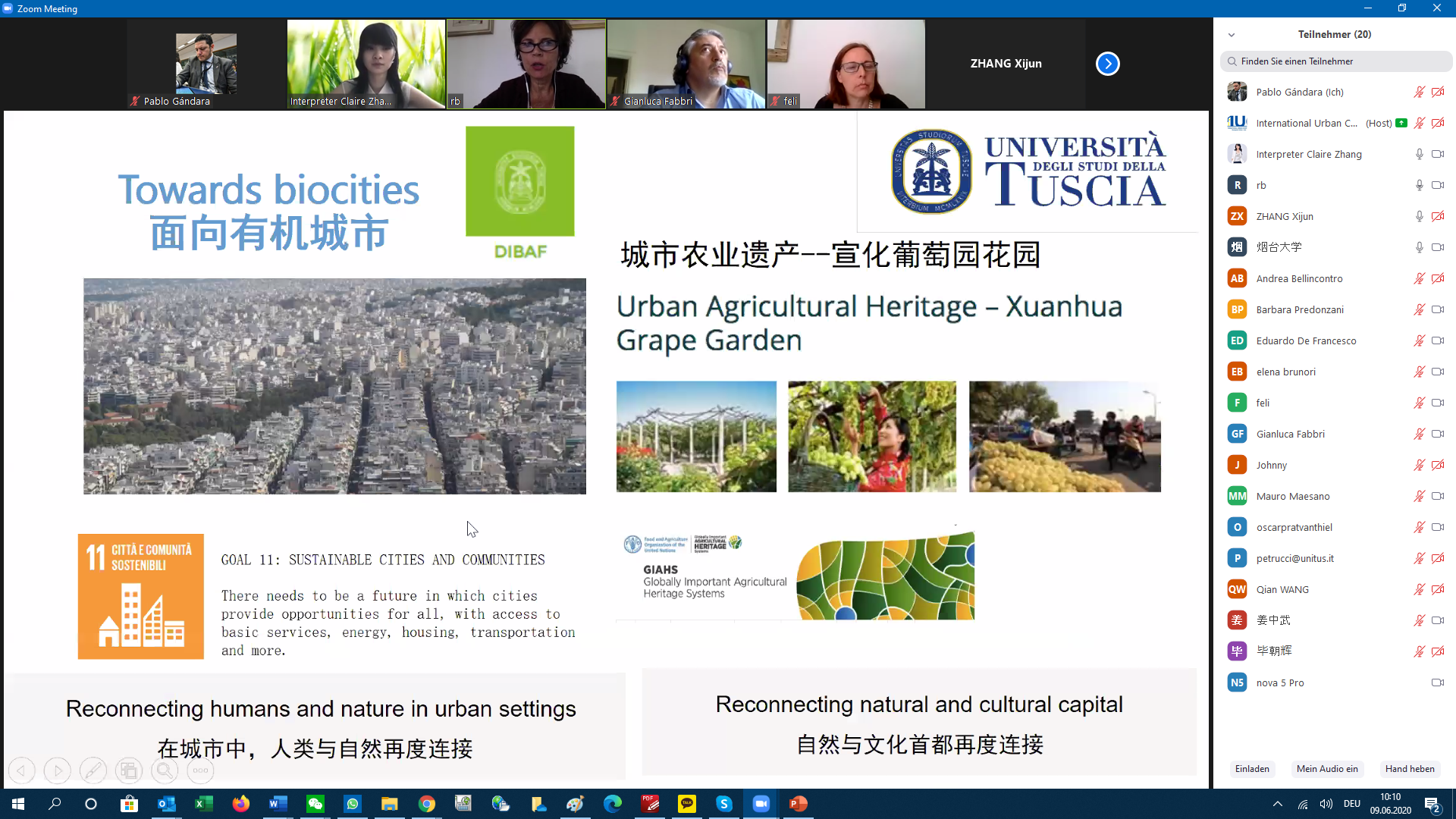 Professor Rita Biassi from the Department for Innovation in Biological, Agri-food and Forest Systems (DIBAF) at the University of Tuscia proposed to cooperate in urban/peri-urban viticulture and integrated landscape management as a way to maintain the competitiveness of the wine sector in light of ongoing environmental emergencies, e.g. land degradation. Peri-urban areas surrounding large cities like Rome and Yantai are crucial for sustainable regional development as they include transition zones. Professor Biassi stated that climate change is a challenge that makes the development of new grapevine geography necessary. Peri-urban areas in the Lazio region need to develop adaptation and mitigation strategies in a contest of decreasing surfaces and increasing wine consumption. Cooperation with China would support the sustainable development goals of the UN, specifically goal 2 (zero hunger), 11 (sustainable cities and communities), 13 (climate change), and 15 (life on land).