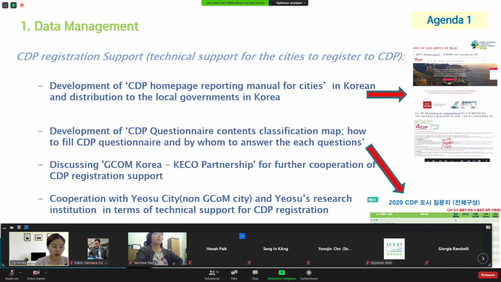The IUC Asia project team participated today in this year’s second online stakeholders’ meeting for the Global Covenant of Mayors (GCoM) in Korea. The event was attended by 12 participants representing the country’s GCoM Secretariat, the Brussels-based GCoM Secretariat, the IUC project as well as GCoM partners from ICLEI, CDP, C40, CityNet, and the Seoul Metropolitan Government (SMG). The meeting provided an opportunity for partners to share their latest relevant activities and to align the work plan 2020. Besides, the GCoM Korea secretariat steered a discussion about the common reporting framework as a benefit for cities. Ms. Eunyoung Seo also emphasised the need to have a broad set of best practices from GCoM and CDP cities worldwide that can inspire Korean local policymakers.