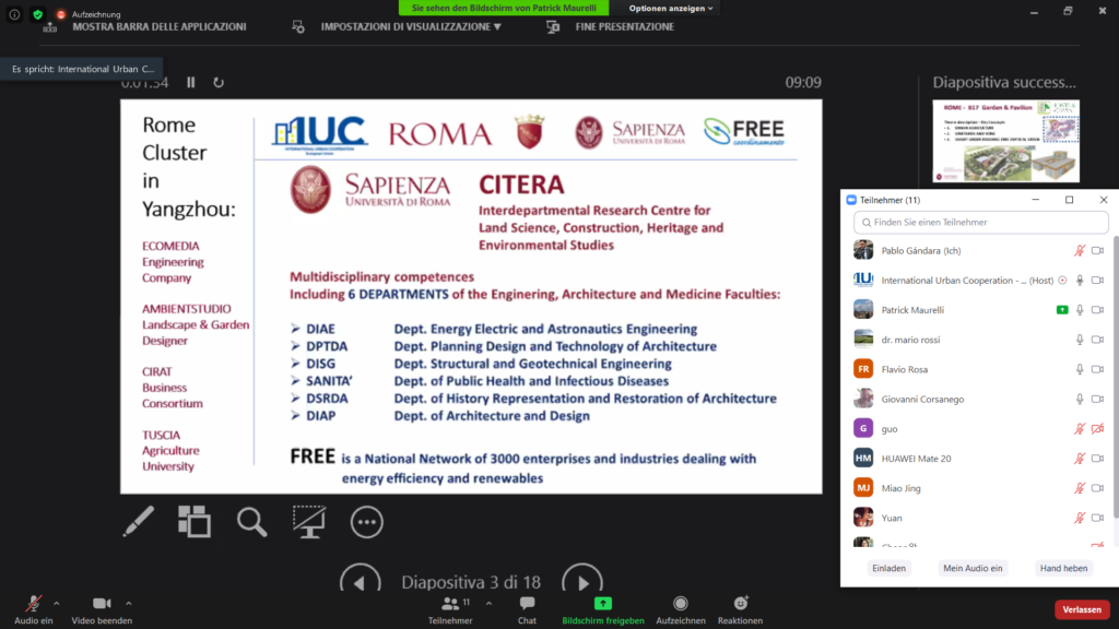 The IUC team organised an online meeting between experts from Rome and Yangzhou to discuss some technical details of Rome’s garden pavilion design as well as of few possible events to be organised by Rome during the Yangzhou Horticulture Expo 2021. Dr. Patrick Maurelli and Dr. Flavio Rossa from CITERA at Sapienza University first explained the three themes of the Rome garden: urban agriculture, vineyard & wine, and smart green building & vertical green.