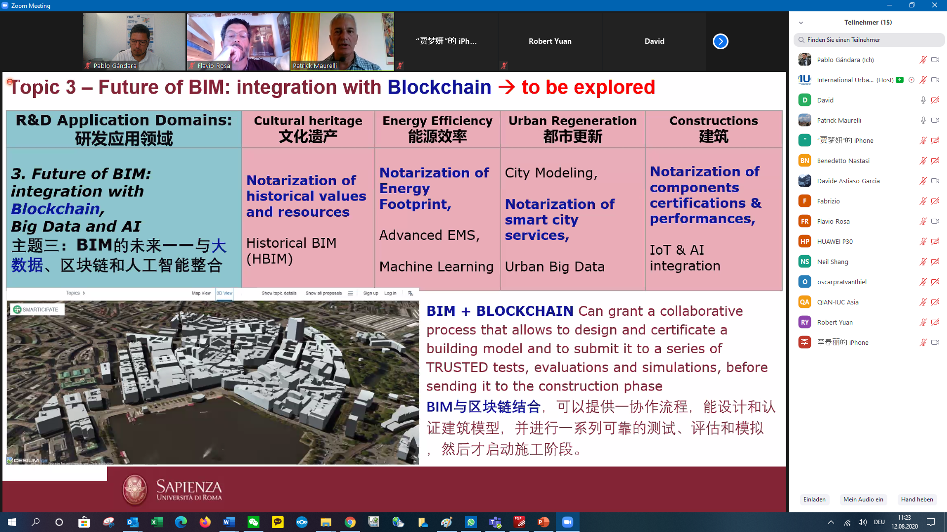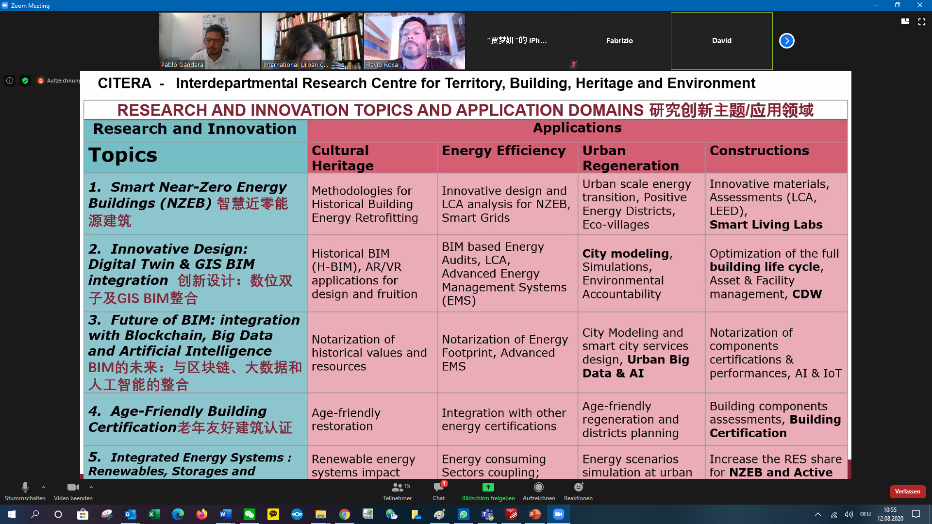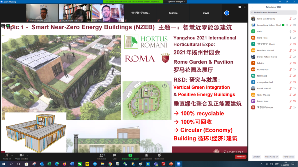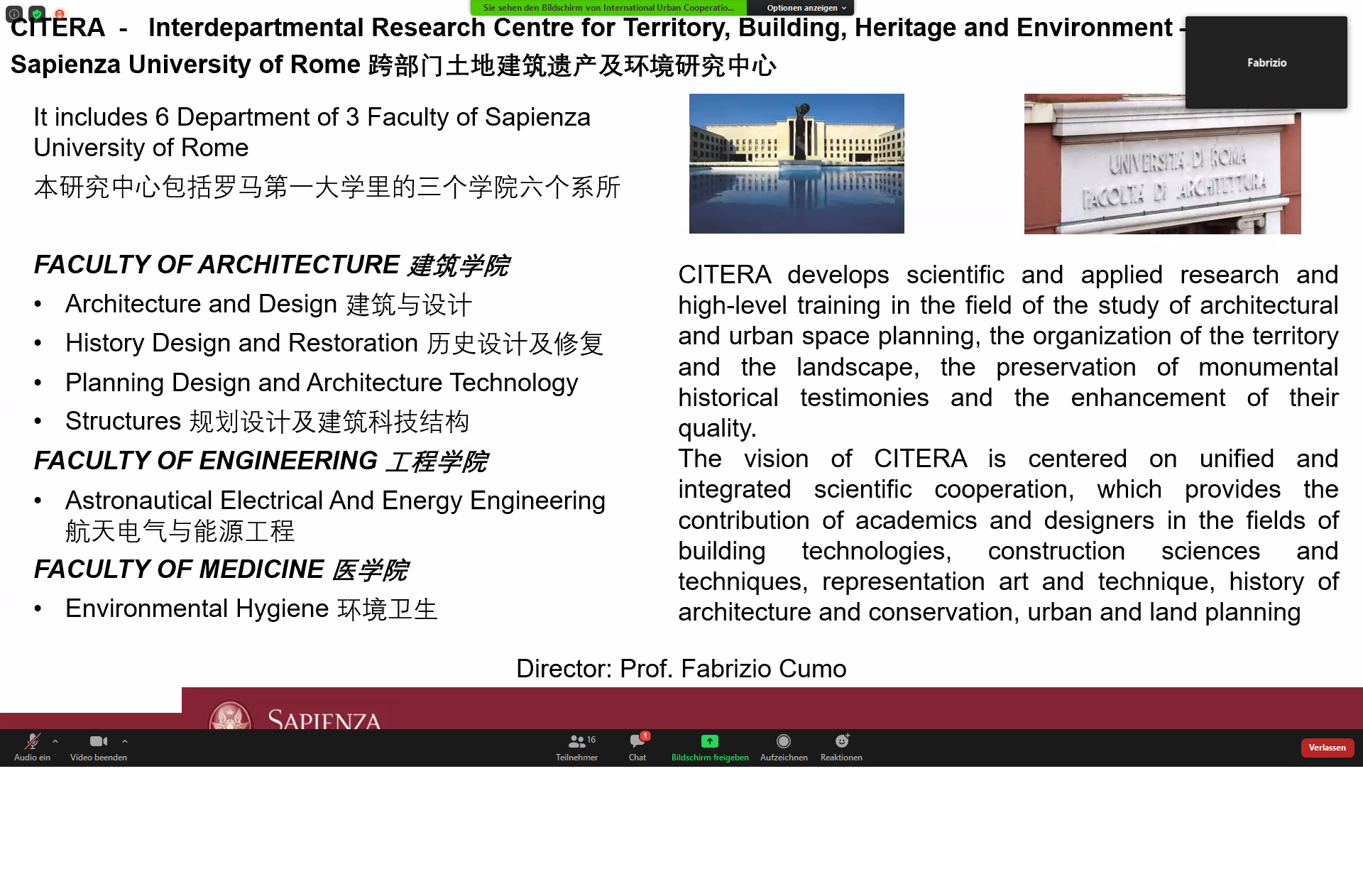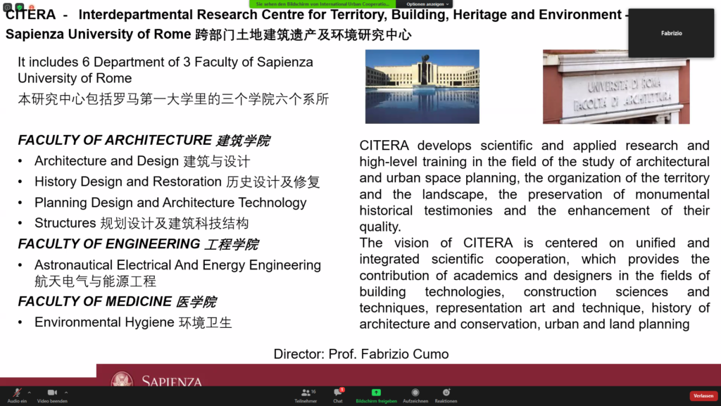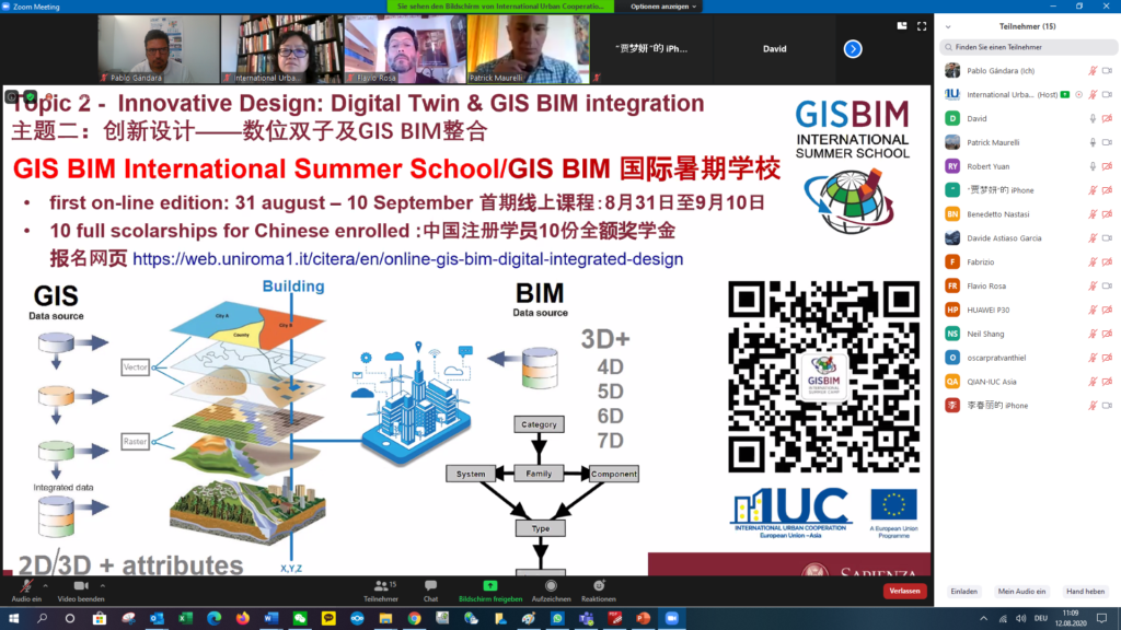 Experts from Rome’s Sapienza University (CITERA – Interdepartmental Center for Territory, Building, Restoration, Environment, Planning, Design, and Technology of Architecture) held an online meeting with Chinese urban technology partners to identify concrete business and research cooperation in Chinese cities. The event was also joined by representatives of RDI – Research and Development International (for further information, please see their website). The meeting also promoted the participation of Chinese practitioners/students in the summer school on digital tools (GIS and BIM) for urban planning, supported by the EU through the IUC competitive fund.
