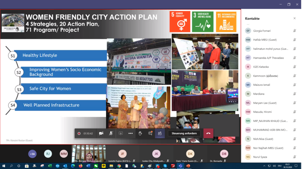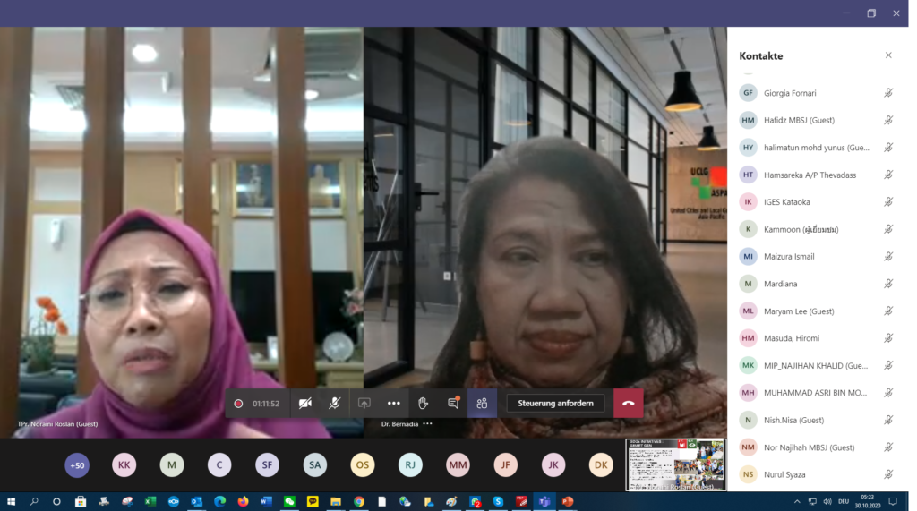 Afterwards, a panel discussion was moderated by Dr. Bernadia Irawati Tjandradewi, Secretary General, United Cities and Local Governments Asia-Pacific (UCLG-ASPAC). The first topic was Global Guidance on VLRs with Riina Jussila, Sustainable Development Officer, National Strategies and Capacity Building Branch, Division for Sustainable Development Goals, United Nations Department of Economic and Social Affairs (UNDESA) and Martino Miraglia, Programme Officer, Technical Focal Point for Local & Regional Governments and VLRs, Urban Practices Branch, United Nations Human Settlement Programme (UN-Habitat). The second topic was VLR examples from Asia and the Pacific with Junichi Fujino, Programme Director, Institute for Global Environmental Strategies (IGES) and Junko Ota, Former Vice-Chair, SDGs Council of Kitakyushu City, Japan. The final topic for the panelists was Reviewing local SDG progress in South-East Asia and the Pacific with Hon. Dato Haji Haris Bin Kasim, Mayor, Shah Alam, Malaysia, Hon. Noraini Roslan, Mayor and Subang Jaya, Malaysia.