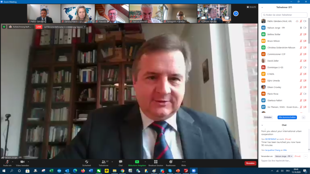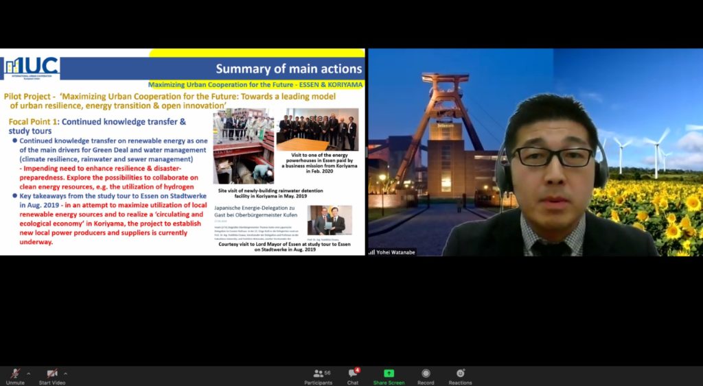 Cooperation on urban development between the EU and Japan was presented by Yohei Watanabe, Chief of the Business Creation Division of Koriyama City. He explained the cooperation with Essen (Germany) on urban resilience, energy transition & open innovation. Areas of cooperation include knowledge transfer on renewable energy as one of the main drivers for the Green Deal and water management (climate resilience, rainwater and sewer management). He said that there is an impending need to enhance resilience & disaster-preparedness. Also, possibilities to collaborate on clean energy resources, e.g. the utilization of hydrogen, should be explored. He mentioned that one of the key takeaways from the study tour to Essen (Stadtwerke) in Aug. 2019 was the attempt to maximize the utilization of local renewable energy sources and to realize a ‘circulating and ecological economy’. This has inspired Koriyama to establish new local power producers and suppliers’ structure. With regard to the COVID-pandemics, children in Koriyama joined the ‘Symbol of cross-national solidarity’ project to share a sense of unity, empathy and encouragement against COVID-19 with Essen in May 2020.