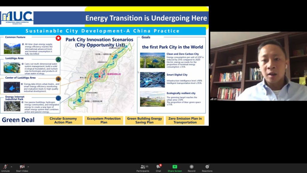 Representatives from Chengdu explained the energy transition happening in Sichuan province, especially in the Luxizhigu Area of Chengdu, which is currently developing the world’s first “Park City“. Here, energy consumption per unit of GDP is reduced by 25% compared to 2020 and renewable energy accounts for the proportion of terminal energy consumption ≥35%. The park city’s greening target reaches the urban area ≥50% and the proportion of blue-green space ≥75%.  Mr Yi LIU – Deputy Director at Sichuan’s Energy Internet Research Institute (EIRI) – referred to the MoU to be signed with Rome Sapienza University and Manchester Metropolitan University, which would launch joint research and academic exchange programmes, as well as incubation activities for start-ups and students. He invited further European cities to engage with EIRI at the upcoming 2020 Energy Internet International Innovation & Entrepreneurship Summit starting on 16 October 2020.