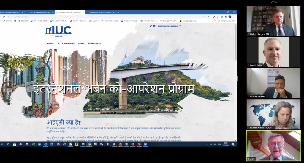 The session was moderated by the IUC regional team leaders Hidefumi Imura (IUC Japan), Panagiotis Karamanos (IUC India) and Pablo Gándara (IUC Asia). They referred to the results/potentials of city-to-city cooperation in the Smart City and Green Deal areas. They also showed resources provided by the different regional teams as well as by the Brussels-based project support unit, including an overview publication of city-to-city achievements published in June 2020.