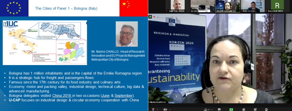 Alexandra Lehmann, Attaché, EU Delegation to China introduced representatives of Bologna, Chendgu, Granada & Yangzhou, and moderated an interactive discussion between the cities. In her introduction, Ms. Lehmann referred to the U-CAPs of these four cities which focus on specific areas like industrial design & circular economy cooperation, blockchain technology and life sciences, smart city and energy transition, as well as on the implementation of joint activities within the International Horticultural Exhibition taking place 2021 in Yangzhou.
