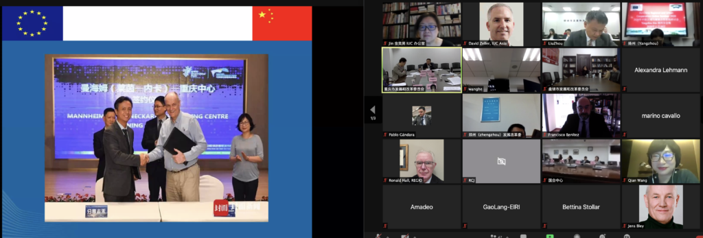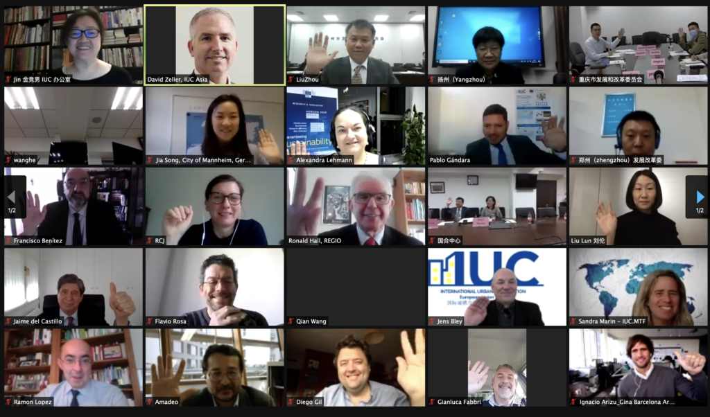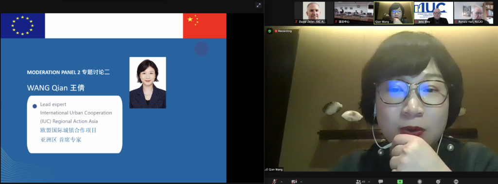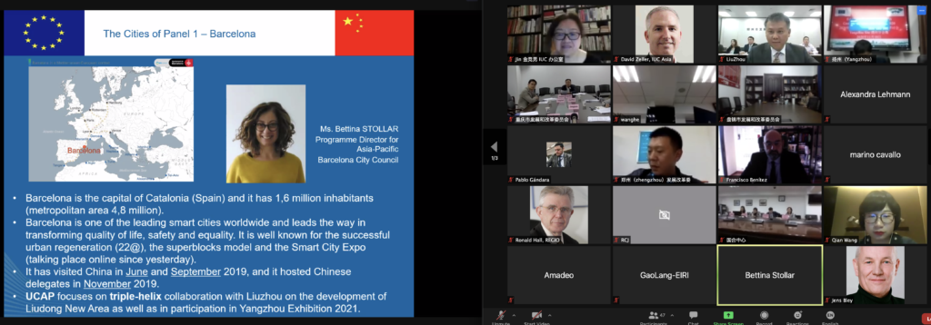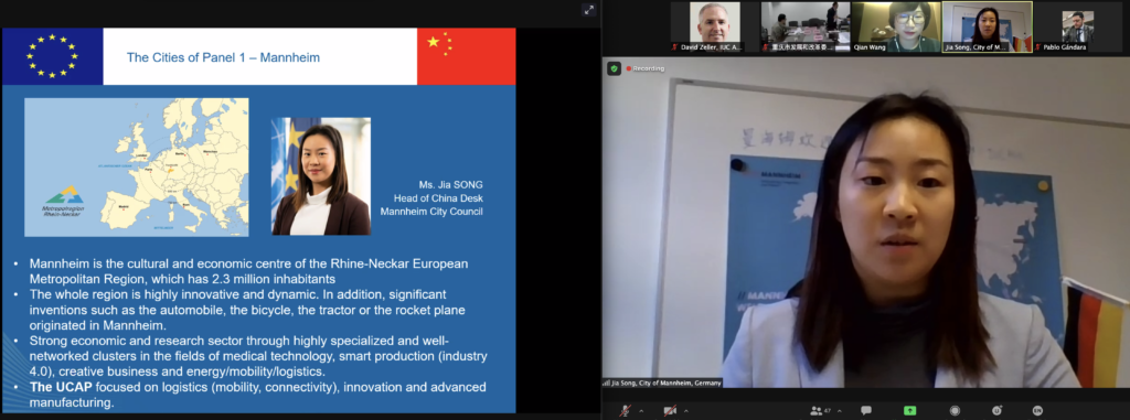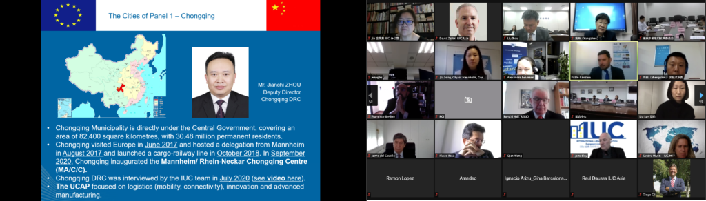 Taking part in this discussion were Bettina Stollar, Programme Director Asia-Pacific, Barcelona City Council; Zhuangzhi Yang, Deputy Director, Liuzhou DRC; Jiangchi Zhou, Deputy Director Chongqing DRC; Jia Song, Head of China Desk, Mannheim City Council. Ms. Stollar introduced Barcelona’s Action Plan developed with Liuzhou, which includes triple helix partners from public authorities (Barcelona’s urbanism institute), research (Barcelona’s Polytechnic University), and the business side (Gina Architects). “The IUC programme seems to be a perfect fit for working with China” – she said. Mr Yang from Liuzou reviewed cooperation with Barcelona and emphasised the importance of a cluster-style joint collaboration with other European and Chinese cities. He featured several meetings held between Liuzhou City officials and European cities since 2019 and emphasised the good collaboration notwithstanding pandemics. Ms. Song from Mannheim reviewed the achievements made within the IUC collaboration with Chinese cities, focussing on pilot projects with Chongqing that include the cargo railway connection and the newly launched Mannheim/ Rhein-Neckar Chongqing Centre (MA/C/C). Mr. Zhou from Chongqing reviewed ongoing cooperation within the IUC since 2017 and focused on the before mentioned cooperation projects with Mannheim, inviting other European and Chinese cities to collaborate.