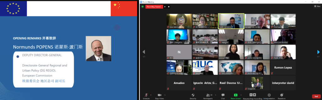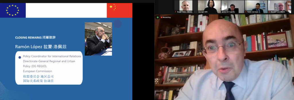 Ramón López Sánchez, Policy Coordinator for International Relations, DG REGIO delivered the closing statements and way forward from the European perspective, stating “As we have seen today from the different presentations, it is clear that the biggest burden of the current crisis is carried by cities. Two third of Europeans and more than 50% of China’s population live already in urban areas and their population will not stop increasing. Cities are hubs for innovation and knowledge but also generate risks and externalities that need to be mitigated and anticipated. I think the meeting today and the exchanges during these last months have been very useful as shows that there is a firm commitment on both sides: