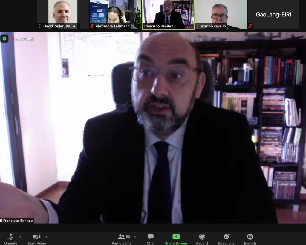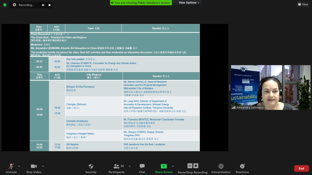 Marino Cavallo (Head of Research Innovation and EU Projects Management, Metropolitan City of Bologna) discussed the cooperation projects Bologna has done with 3 Chinese Cities: Guangzhou, Yangzhou and Nanjing. Lang Gao (Director of the Department of Innovation & Development at Sichuan’s Energy Internet Research Institute – EIRI) introduced cooperation activities with European cities within EIRI’s flagship innovation events held in 2020. Francisco Benitez, Blockchain Project Coordinator of Granada introduced the lessons learned from the webinar series on the impacts of blockchain technologies for the cities development in areas like circular economy, smart city and health, and announced a bilingual platform to be launched in December 2020. Zhaojun Cheng, Deputy Director Yangzhou DRC explained the progress made with four European IUC pilot cities in the upcoming International Horticultural Exhibition.