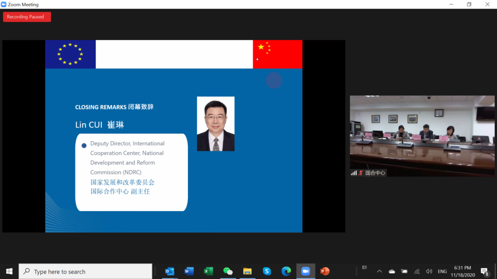 Providing closing remarks and the way forward from the Chinese perspective, Lin Cui, Deputy Director, International Cooperation Center, National Development and Reform Commission (NDRC) agreed with the statement of his European colleague, expressing his appreciation for the valuable cooperation being undertaken in the areas of Smart Cities and Innovation with respect to the IUC programme. Deputy Director Cui further stressed, “it is hoped that all parties concerned will actively participate in the China-EU regional cooperation opportunities, expand the field of China-EU regional cooperation, and expand the space for China-EU regional cooperation. Congratulations on the successful conclusion of the 2020 EU-China Regional and Urban Cooperation seminar, and we wish EU-China regional policy cooperation a new lease of life in the new era.”