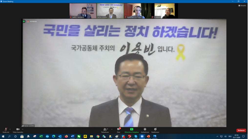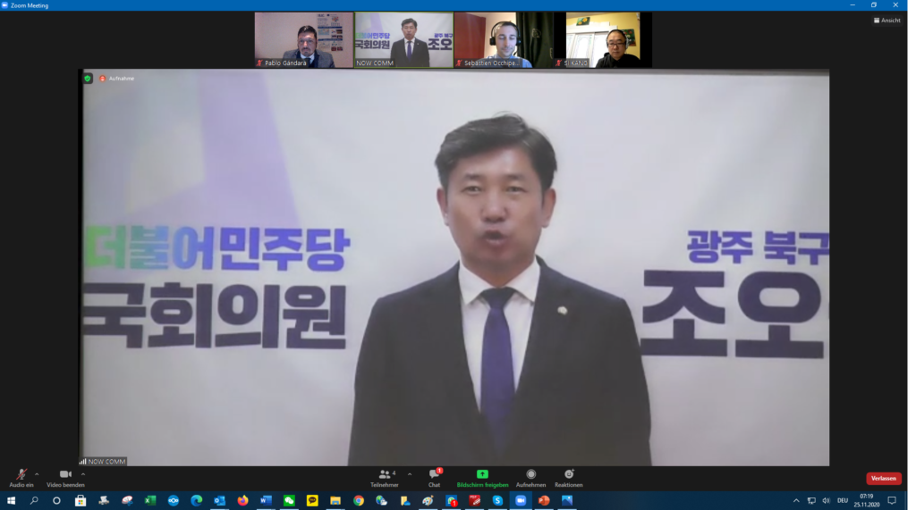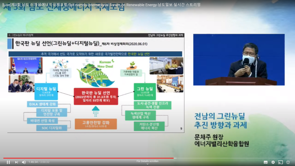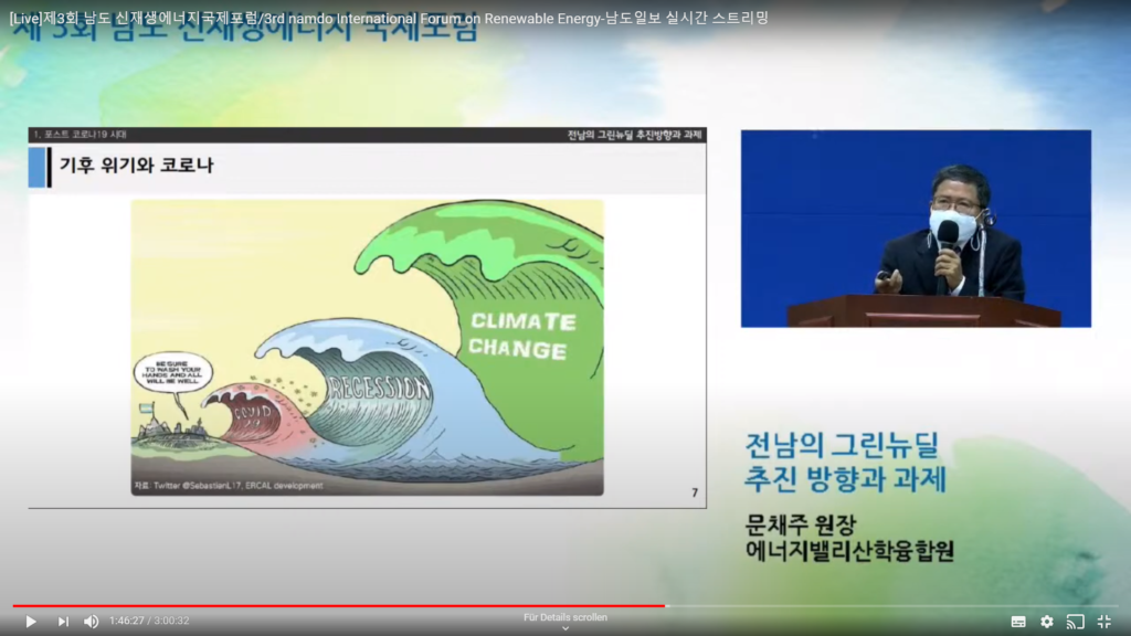 Following the opening ceremony formalities, Dr. Won Tae Yun, President of ICEC, provided an opening statement referring to climate action in times of COVID. He stated that CO2 emissions levels have in fact reached a peak in 2020, which will be the warmest year since monitoring the global temperature. He referred to IPCC reports urging to decrease CO2 emissions to avoid a point of no return. In Gwangju and Jeolla Province, decarbonizing the economy is a challenge – he stated. The potential for renewable energy production in the city and the province is huge – he said.
