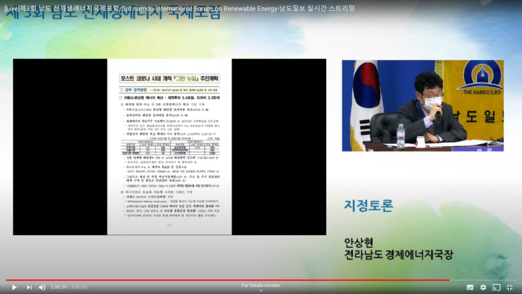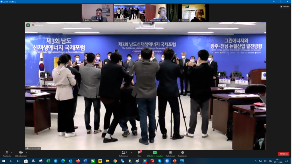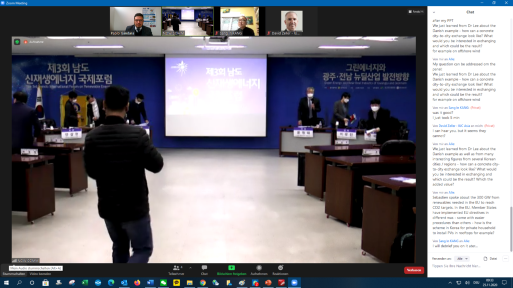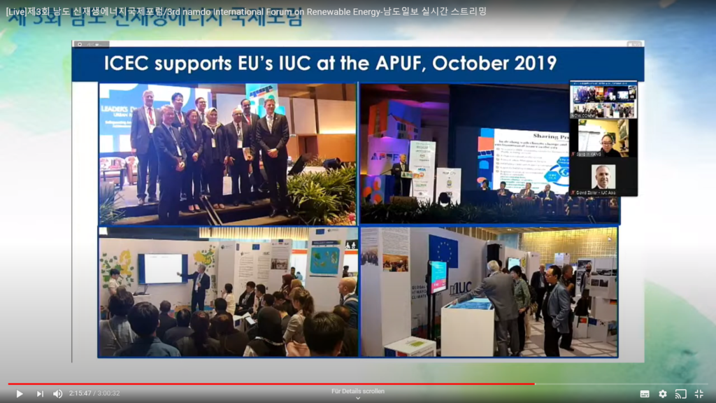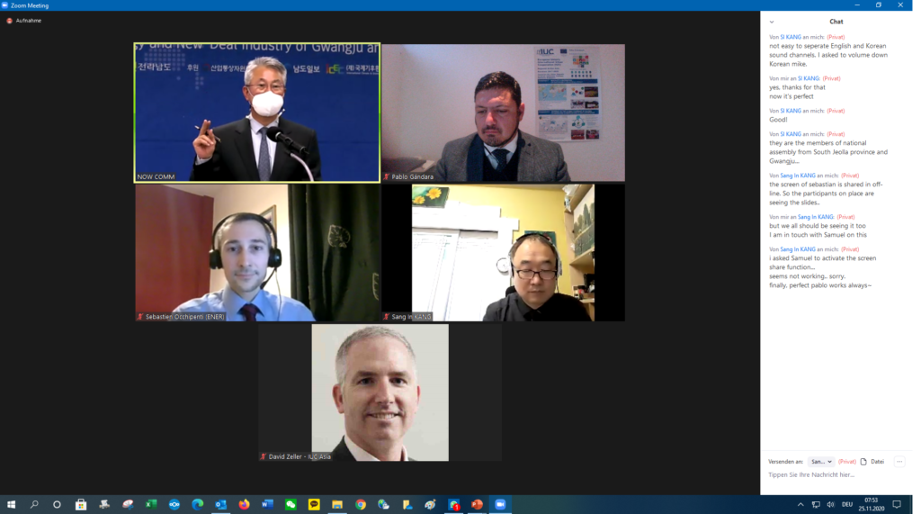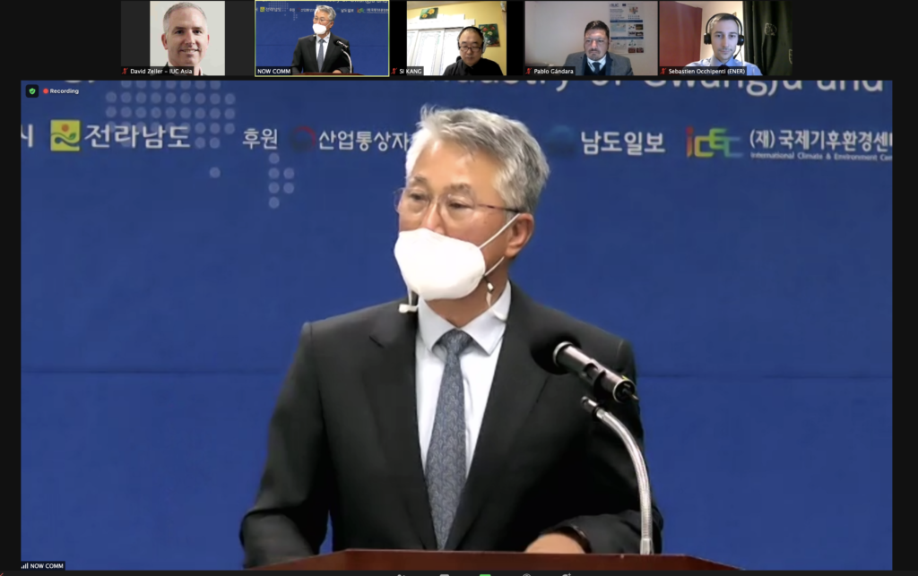 Today, the Directorate-General for Energy of the European Commission (ENER) and the IUC Asia team participated in the 3rd International Forum on Renewable Energy, on the topic of Green Energy and New-Deal Industry of Gwangju and Jeonnam (Gwangju Metropolitan City and Jeonnam Province, Republic of Korea). The hosts of the hybrid online and offline conference were Gwangju Metropolitan City, Jeonnam Province / International Climate & Environment Center (ICEC), Gwangju Jeonnam Institute and Namdo Daily, which covered the event. Since 2017, the IUC project has implemented several training activities on climate action with Gwangju city.