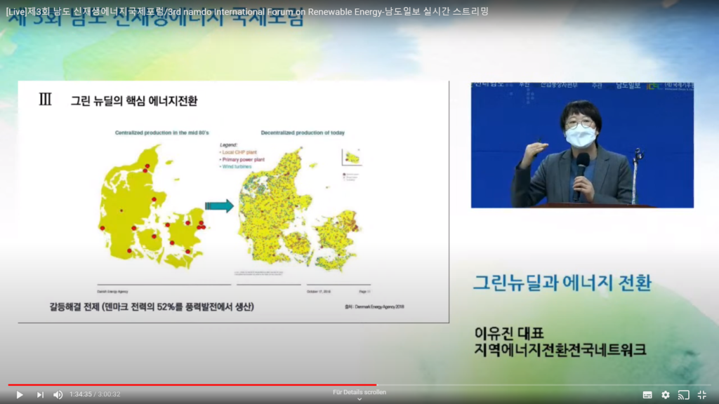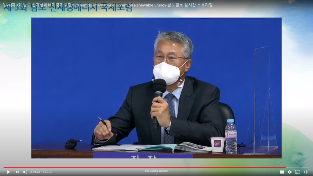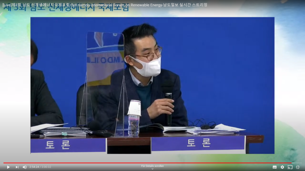 Further presentations were made by Yu Jin Lee (President, Local Energy Transition Network) and Chae Joo Moon (President, Energy Valley Industry-University Convergence Agency – EIUCA). Ms. Lee referred to the crucial importance in phasing out coal-fired power plants in order to reach Korea’s goal of net-zero CO2 emissions by 2050. She referred to best practices from the European Union, including Denmark’s high decentralisation of energy generation and the EU’s Carbon Border Adjustment (CBA). She urged Korea to increase the share of renewable energy production – the lowest of all OECD countries, she said – through the pricing system and building public consensus. Mr. Moon focused on the potential of offshore wind parks in Jeolla Province, the importance of a stable distribution grid, and the costs sharing options for onshore and offshore substations.