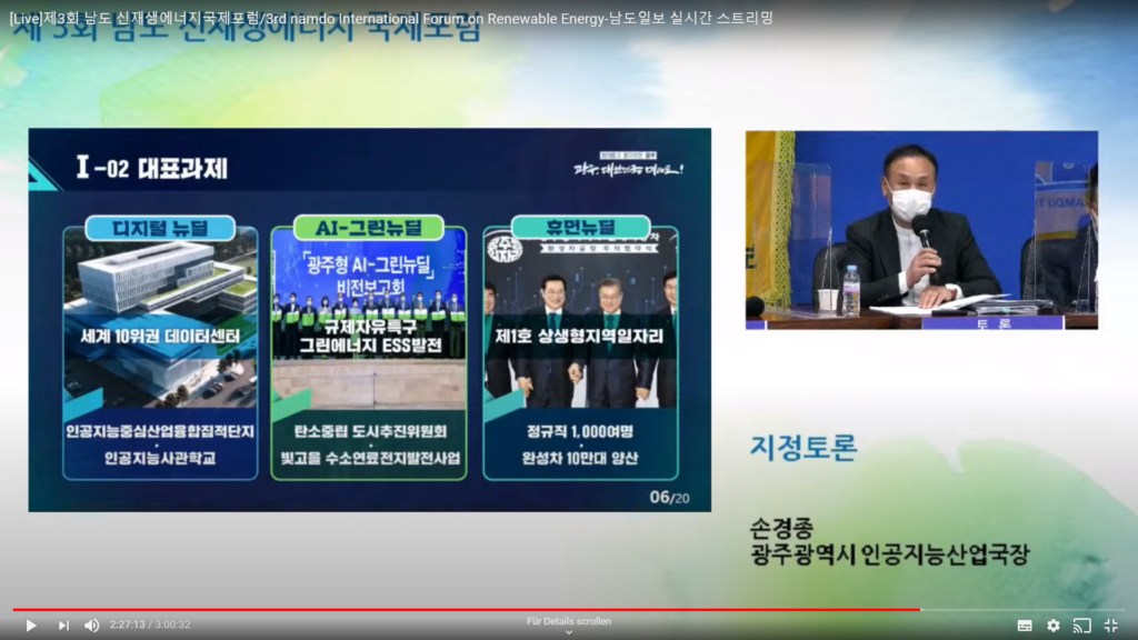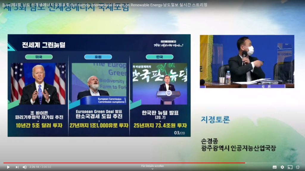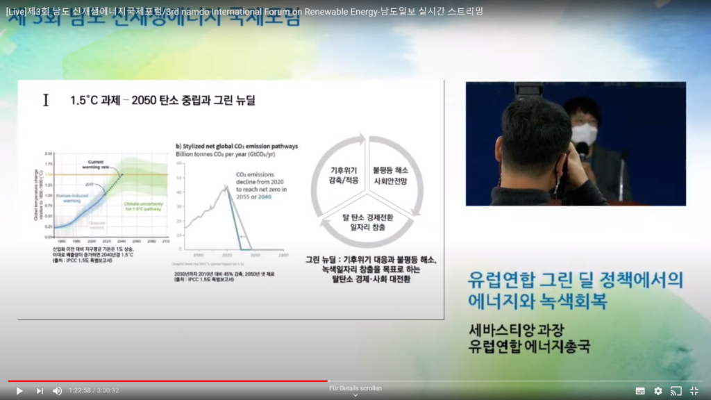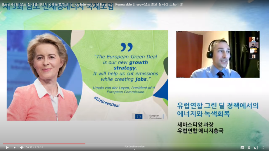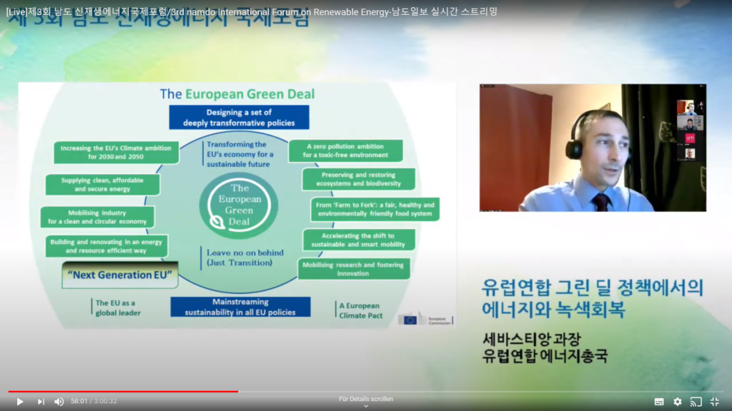 In the panel discussion with the Korean experts, several areas of Korea’s Green New Deal were discussed, including energy efficiency and smart grids, efforts to produce hydrogen through renewables (green hydrogen) and the need for manufacturing companies to invest in environmentally friendly raw materials. Speaking about Gwangju, Director Son explained that the metropolis aims to become energy independent by 2045 and that artificial intelligence will be crucial to achieving this target. Director Ahn from Joeonamm Province referred to the job creation challenges of the energy transition. They expressed their interest in learning from the EU about ways to compensate for job losses through the just transition mechanism.