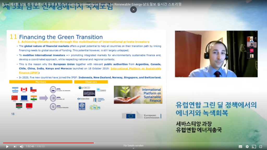 Dr. Won then introduced keynote speaker, Sébastien Occhipenti, International Relations Officer of the European Commission for DG Energy. Mr. Occhipenti stated that “Our path to climate neutrality by 2050 is irreversible...the goal of the European Green Deal is to build a holistic approach of the clean energy transition. And, this requires unprecedented transformation and it will be the backbone of the green recovery from the COVID-19 crisis...through our Just Transition Mechanism, we will ensure that to ensure that no region is left behind in clean energy transition and mobilise at least EUR 100 billion, through financial support, transition plans, attractive conditions and technical assistance”. Mr Occhipenti further referred to the Strategy for Energy System Integration (unveiled in July 2020 which will links energy sources and infrastructure to support decarbonisation), the EU Clean Hydrogen Strategy (to reduce GHG emissions across industry, transport, power and buildings sectors), the Methane Strategy and the Renewable offshore energy to accelerate the wind capacity foreseen to grow 20-fold. The Commission is further reviewing the Renewable Energy and Energy Efficiency Directive and the TEN-E Regulation (Trans-European Networks-Energy Regulation). While speaking about the cutting emission potentials in the EU, he stated that buildings account for 40% of EU energy consumption and 36% of the greenhouse gas emissions. “Since the construction sector mobilises 10% of EU GDP, a building renovation wave may boost economic recovery in the EU by creating 160 000 green jobs in the construction sector by 2030″ – he said.
