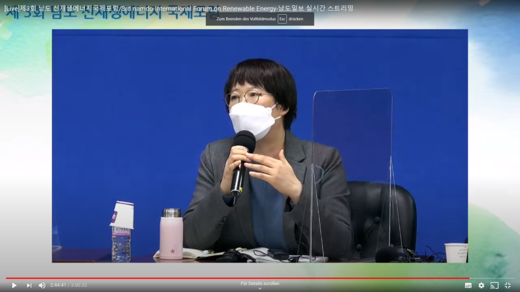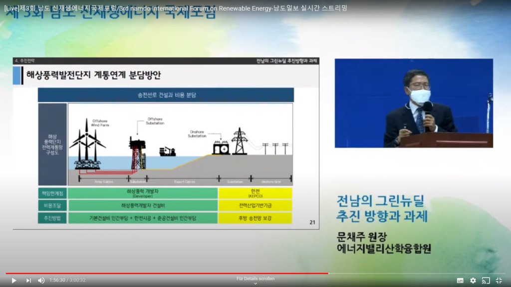Further presentations were made by Yu Jin Lee (President, Local Energy Transition Network) and Chae Joo Moon (President, Energy Valley Industry-University Convergence Agency – EIUCA). Ms. Lee referred to the crucial importance in phasing out coal-fired power plants in order to reach Korea’s goal of net-zero CO2 emissions by 2050. She referred to best practices from the European Union, including Denmark’s high decentralisation of energy generation and the EU’s Carbon Border Adjustment (CBA). She urged Korea to increase the share of renewable energy production – the lowest of all OECD countries, she said – through the pricing system and building public consensus. Mr. Moon focused on the potential of offshore wind parks in Jeolla Province, the importance of a stable distribution grid, and the costs sharing options for onshore and offshore substations.