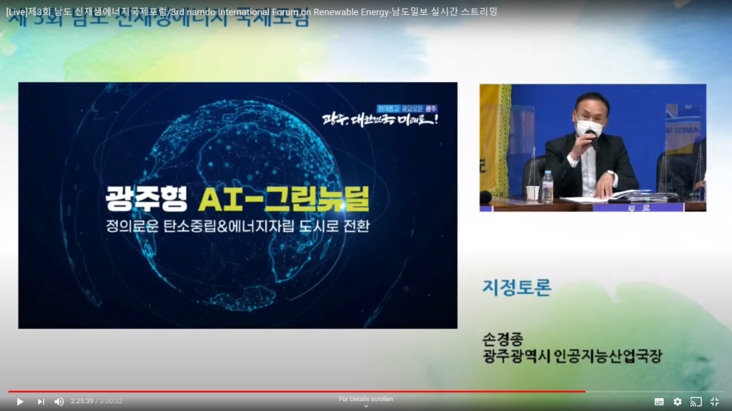 In the panel discussion with the Korean experts, several areas of Korea’s Green New Deal were discussed, including energy efficiency and smart grids, efforts to produce hydrogen through renewables (green hydrogen) and the need for manufacturing companies to invest in environmentally friendly raw materials. Speaking about Gwangju, Director Son explained that the metropolis aims to become energy independent by 2045 and that artificial intelligence will be crucial to achieving this target. Director Ahn from Joeonamm Province referred to the job creation challenges of the energy transition. They expressed their interest in learning from the EU about ways to compensate for job losses through the just transition mechanism.