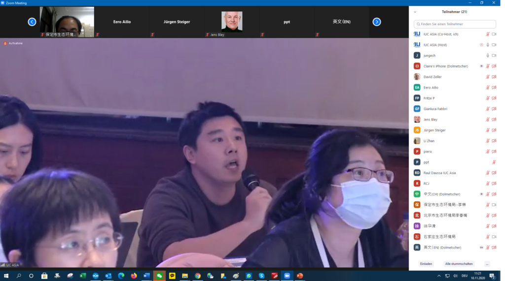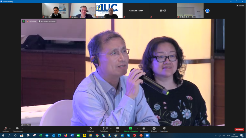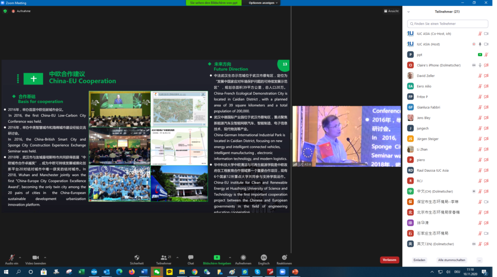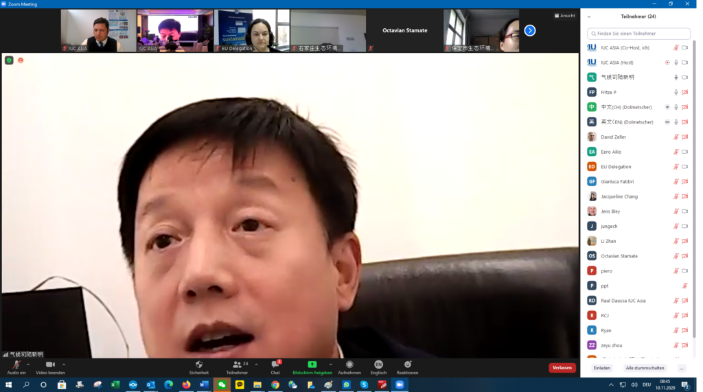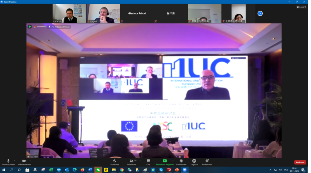 The IUC Asia project held today a three-hour workshop on the transition from EU and Chinese cities towards low carbon development. The meeting involved nearly 40 participants – partly onsite in Beijing and partly online (via video conferencing). The event was a follow-up activity to the online exchange session on the EU-China Low Carbon Cities Study that took place between European and Chinese experts on 27th May 2020 (see online coverage here). The workshop reviewed the policy implications of the European Union’s Green Deal for European cities with regard to their transition towards low carbon. It also took stock of China’s results on lowering CO2 emissions within the 13th Five Year Plan (2016-2020) and draw possible implications for the upcoming 14th Five Year Plan (2021-2025) currently under elaboration. Experts from the cities of Hamburg, Milan, Ningbo and Wuhan shared their experiences in decreasing CO2 emissions and made make recommendations for the EU-China cooperation on local climate action. Onsite in Beijing were also represented the Chinese cities of Beijing, Chengdu and Tianjin. The event was organized by the IUC-Asia project in cooperation with the National Centre for Climate Change Strategy and International Cooperation (NCSC). Keynotes were held by Octavian Stamate – Councellor for Energy and Climate Action at the EU Delegation to China -, Mr. Xinming LU – Deputy Director-General for the Department of Climate Change at the Ministry of Ecology and Environment (MEE) -, Mr Eero Ailio – Principal Advisor for Energy Transition and Local Governance at the Directorate Energy for Energy of the European Commission (DG ENER) -, and Ms. Ying CAO – Research Director at the Department of Policy and Regulatory of China’s NCSC – and Mr. Huaqing XU – also Director at NCSC.