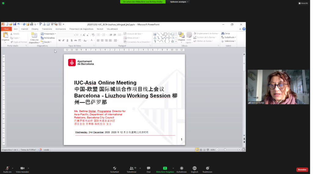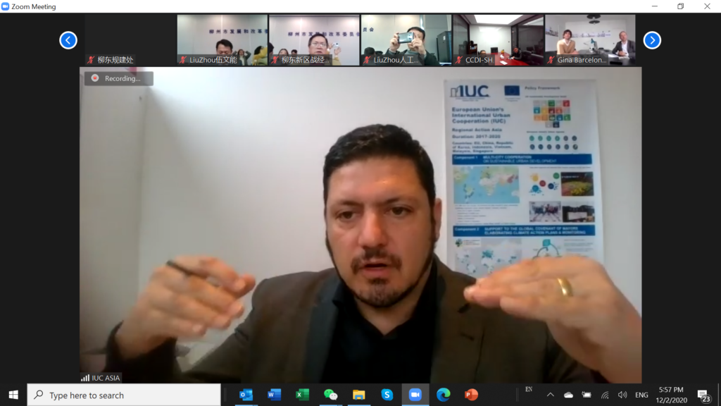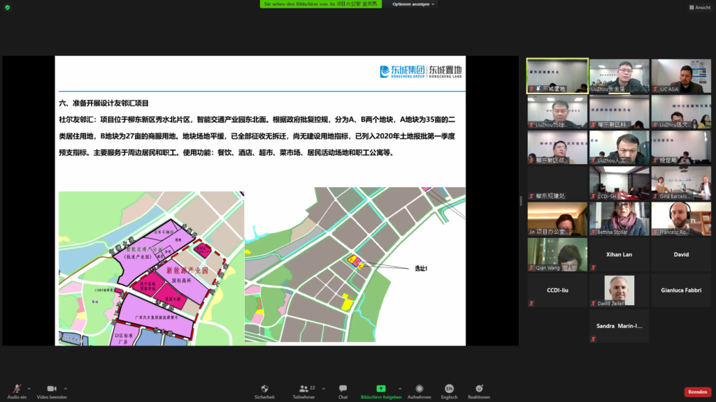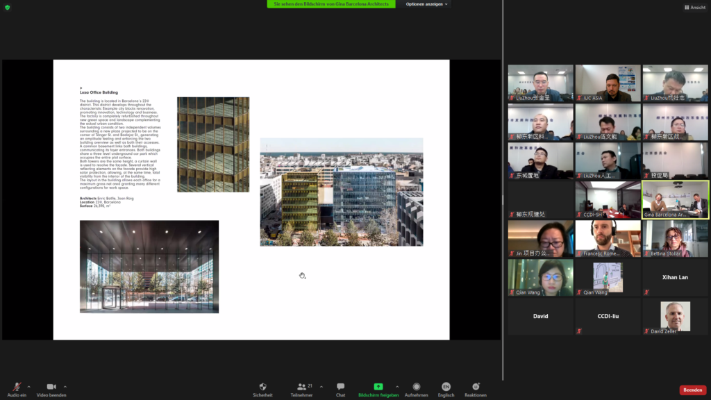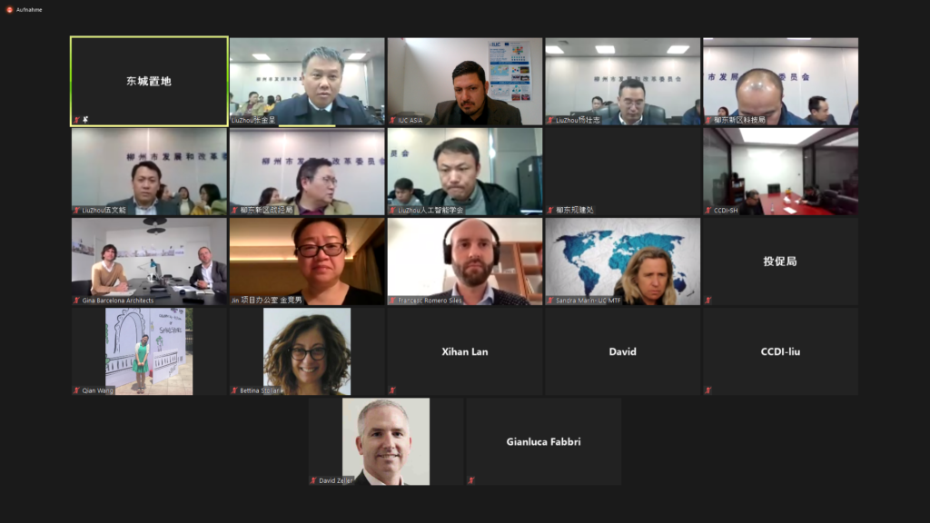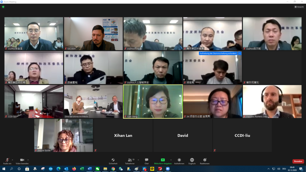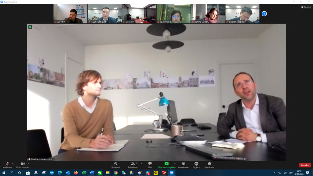 Over 25 experts from Barcelona and Liuzhou met today online to discuss the progress of cooperation between both cities including the action plan and the possible collaboration between the urban development companies GINA Architects from Barcelona and CCDI from China. The event was opened by authorities from Barcelona City Council and Liuzhou Municipality and included presentations by Wang Qiang and Pablo Gándara from the IUC team, Bettina Stollar from the Department of International Relations at Barcelona City Council, Francesc Romero from the Municipal Institute of Urbanism in Barcelona, Jaime Batlle from GINA, Xin ZHANG from CCDI, Jincheng Zhang from Liudong New District in Liuzhou and Jia GUO from the Liuzhou Dongcheng Group.