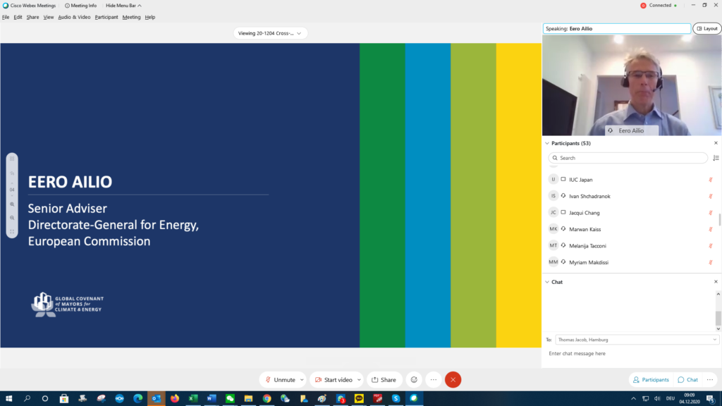 The morning session focused on EU-Asia collaboration within the GCoM. Eero Ailio, Senior Advisor at the Directorate-General for Energy of the European Commission, welcomed the participants, discussing local action paving the way to climate neutrality. Mr. Ailio referred to the encouraging experiences in mitigation of GHG emissions and adaptation to the effects of climate change shared by Asian cities since the launching of the GCoM in 2017. “Our path to climate neutrality by 2050 is irreversible...the goal of the European Green Deal is to build a holistic approach for the clean energy transition, which will be the backbone of the green recovery from the COVID-19 crisis” he stated. Mr. Ailio referred to the increased economic competitiveness of renewable energy as compared to the coal-energy, and was confident that the EU policies would facilitate a smooth transition. “The EU will continue support to local climate action in Asia and peer-to-peer exchange between Asia and EU cities through the Global Covenant of Mayors” – he said. He also referred to the Gap-Fund, a joint initiative by the Global Covenant of Mayors for Energy and Climate, Germany and Luxemburg implemented by the European Investment Bank and the World Bank within the Leadership for Urban Climate Investment.