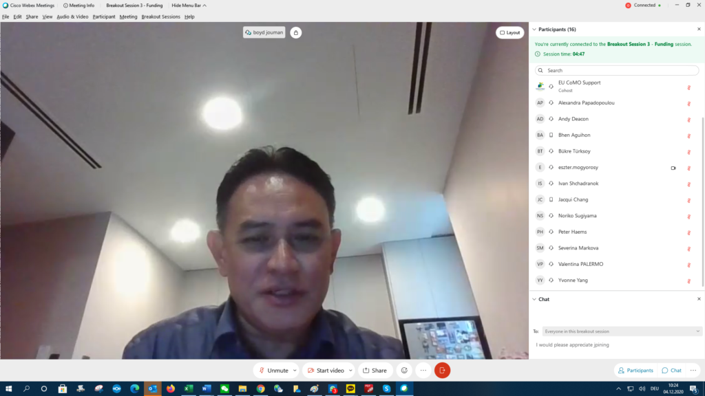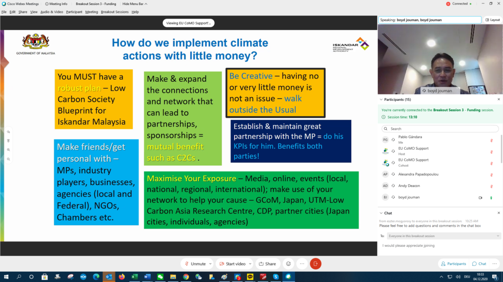 During break-out session I, Raoul Cam, Planning and Development Coordinator of Ormoc City in the Philippines, shared Ormoc’s Climate Action Plan, which identifies the city’s major climate hazards and most affected groups (vulnerable population) to build impactful local actions. As Ormoc City is facing destructive floods and landslides, they have developed adaptation projects including comprehensive agriculture programmes and the utilisation of solar panels. The actions also focus on urban planning to redesign open green spaces and parks as an effort to achieve carbon sink. Nyimas Ida Apriani from the Environmental Agency of Palembang City, Indonesia, shared the recent achievement of the Climate Action Plan developed with support of the EU’s IUC project within the GCoM support. With this CAP, Palembang has mainstreamed the climate issue into the City Development Agenda. She also added that – with the support of the IUC – Palembang has submitted an application to the Gap Fund. In the near future, Palembang will focus on the implementation of its CAP. “Palembang looks forward to more international cooperation, especially in funding to accelerate the achievement of mitigation and adaptation targets” – she said.