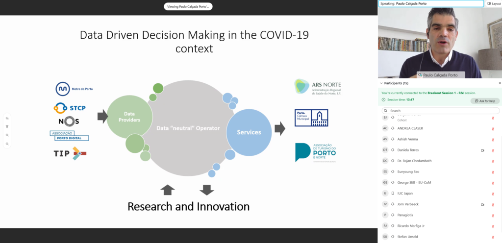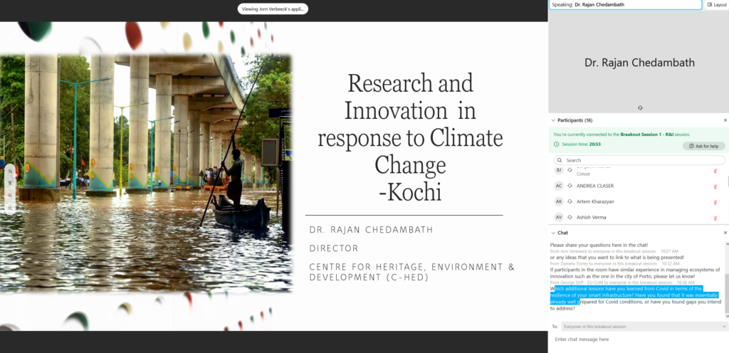The break-out session II focused on implementing cross-sectoral actions and reaping the co-benefits with the support of research and innovation, discussing the reasons why cities should invest in developing these partnerships in order to enhance the knowledge economy, improving well-being and creating wealth. The first speaker, Paulo Calcada from Porto (Portugal) explained how his municipally changed the organisational culture and practices and enhanced the effectiveness of sustainability delivery. By creating an independent entity (Porto Digital) the municipality was able to deliver innovative services for instance in data-driven decision making during COVID-19. The importance of creating local and international partnerships and owning the data were highlighted as some of the lessons learned from the city of Porto. Dr. Rajan Chedambath from Kochi (India) explained how in 100 years the city changed from backwater to landmass and it is therefore vulnerable to climate change impacts, and innovation has been integrated into the climate assessment report and resilience plans. Through IUC city-to-city cooperation with Vilnius (Lithuania), Kochi is adopting a new waste management system. A short Q&A session followed with questions on the involvement of civil servants in R&I projects and how to attract the private sector.
